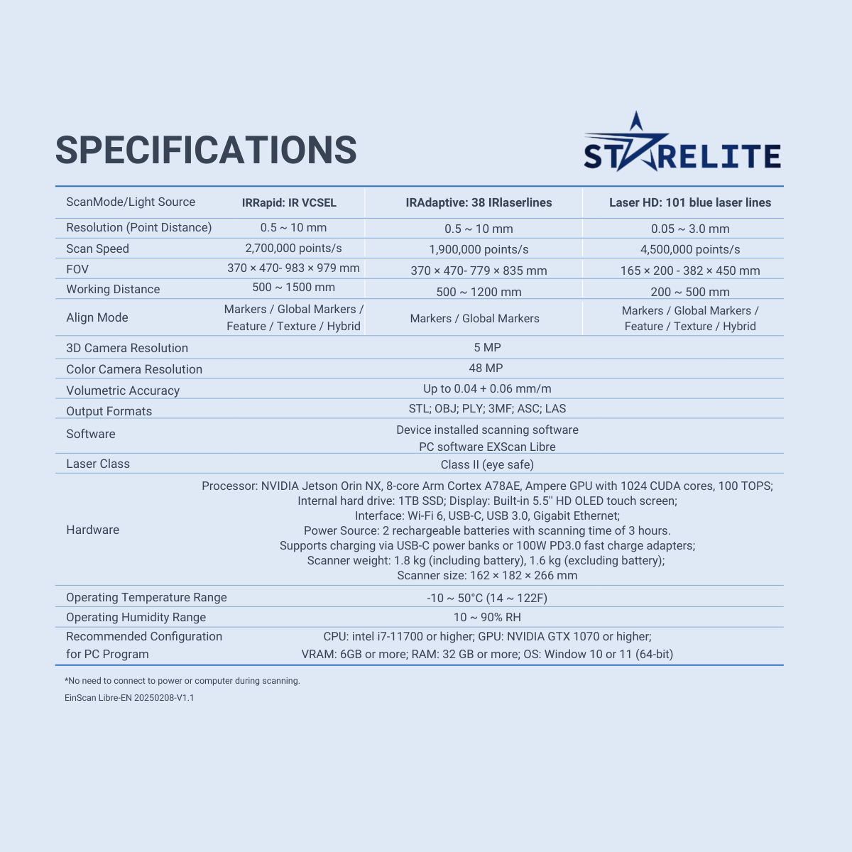 • IR Rapid Mode: sử dụng ánh sáng hồng ngoại VCSEL không cần marker, tối ưu cho việc quét các đối tượng lớn trong điều kiện ánh sáng phức tạp hoặc môi trường ngoài trời. Chế độ này cung cấp trường nhìn (FOV) lên đến 983 × 979 mm và khoảng cách làm việc tối đa 1,5 m, đảm bảo hiệu quả và linh hoạt trong quá trình quét.