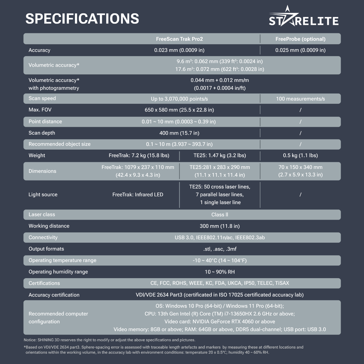 Máy quét 3D FreeScan Trak Pro2 là giải pháp đo lường 3D chuyên nghiệp, kết hợp độ chính xác chuẩn đo lường, tốc độ quét cao và khả năng hoạt động không cần điểm dán linh hoạt. Thiết bị này là lựa chọn tối ưu cho các doanh nghiệp công nghiệp đòi hỏi quy trình hiệu quả, chính xác và tiện lợi — từ kiểm tra chi tiết nhỏ đến quét các bộ phận lớn với năng suất cao.