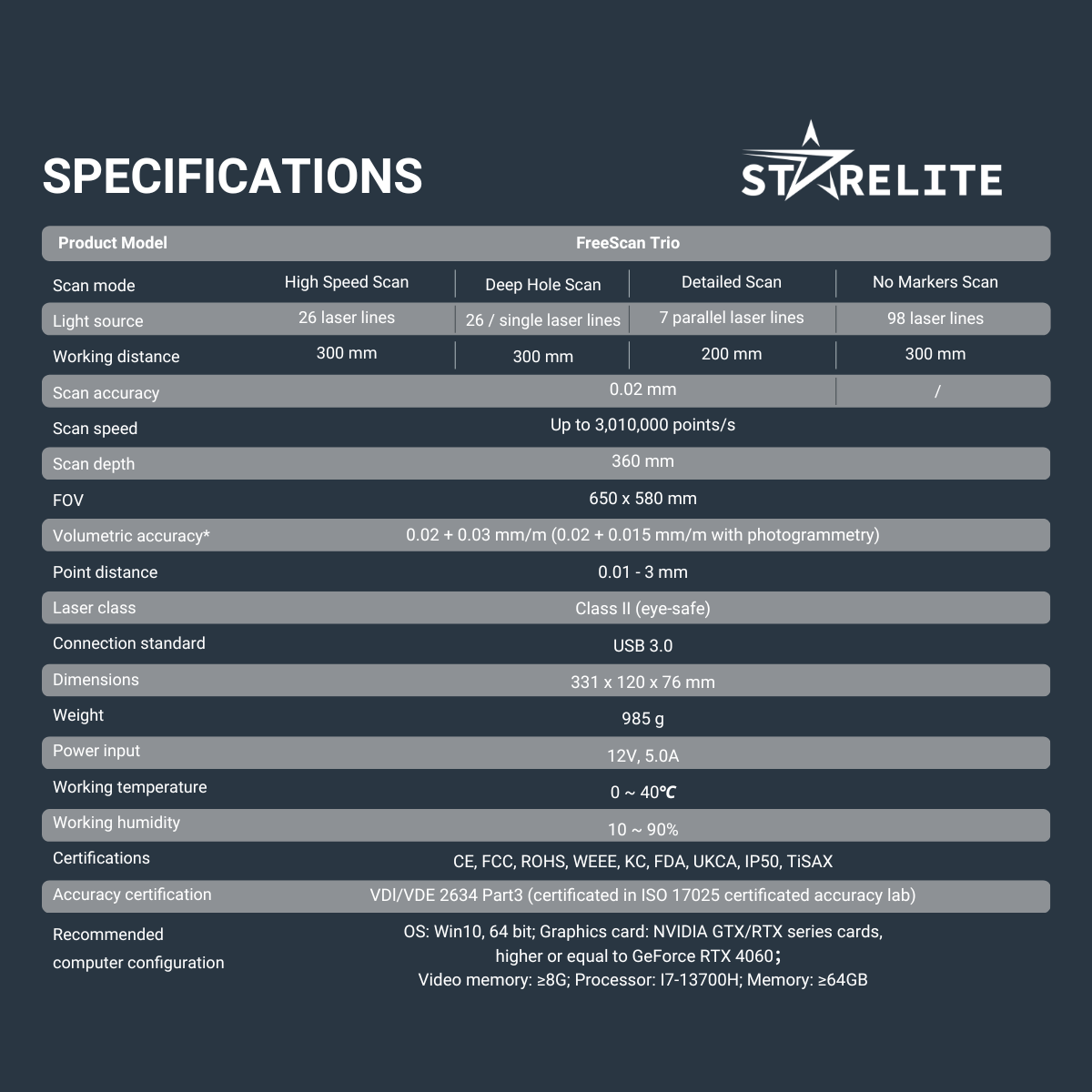 • Photogrammetry tích hợp (VPG) giúp đảm bảo độ chính xác thể tích cao và ổn định, đặc biệt trong quét các vật thể lớn.