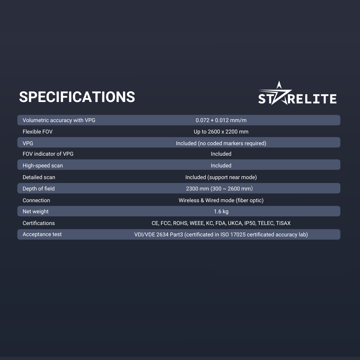 • Công nghệ Video Photogrammetry (VPG) tích hợp: không cần điểm dán, nhưng vẫn đảm bảo đo đạc thể tích chính xác trong thời gian thực, kết hợp với thanh hiệu chuẩn (calibration rod) để xác thực.